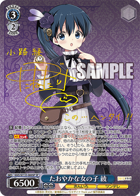 「たおやかな女の子 綾」(´・ω・`)3/2/11000アンコール(´・ω・`)トリガー時に手札が5枚以下ならストックを1枚手札にできる(´・ω・`)門連動でアタック時に···